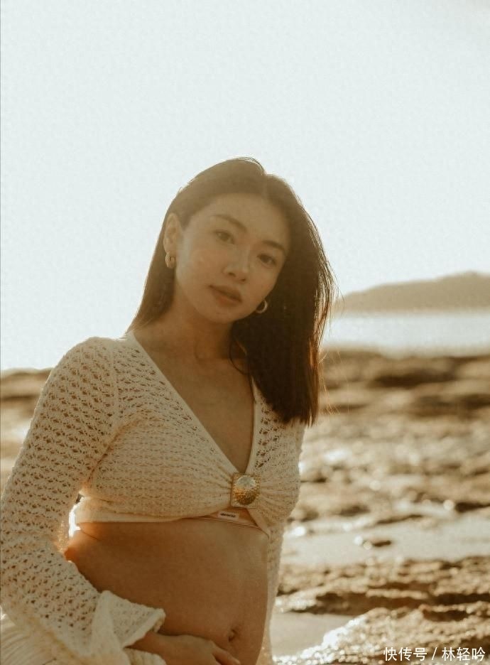 镜头中的她身着米白系针织套装,海风轻扬发梢,一手轻抚高耸圆润的腹部,神情恬静从容,气质温润如初春暖阳。