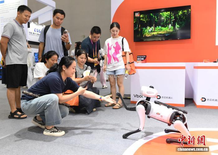 9月5日,2025世界智能产业博览会在重庆开幕。图为民众在博览会上与“机器狗”互动。中新网记者 周毅 摄